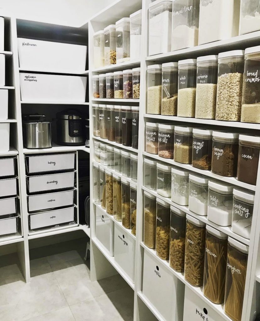 This design takes organization ideas to the next level with tall, uniform clear containers neatly labeled in script. By using vertical shelving, the pantry maximizes space and makes finding ingredients effortless. The thoughtful layout incorporates large white bins for bulk storage at the base, while open shelving ensures quick access to everyday staples like pasta and grains. This style feels almost like a curated boutique—perfect for those who value efficiency and tidiness. Inspired by Ikea cabinet ideas and minimalist aesthetics, it suits both small kitchens and narrow dimensions where order is everything.