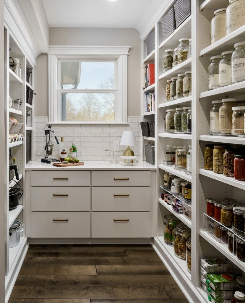 Natural light floods this ideas layout with window, creating a welcoming and functional space. The wide drawers beneath the countertop offer deep storage for utensils, tableware, or even a hidden freezer unit. The shelving is thoughtfully spaced to fit large glass jars and containers, embodying organization ideas for bulk goods. The neutral cabinetry paired with warm wood flooring gives the pantry a modern yet timeless feel, while the small lamp on the countertop adds a cozy touch. For homeowners who value visibility and a refreshing atmosphere, this design blends practicality with design-forward thinking.