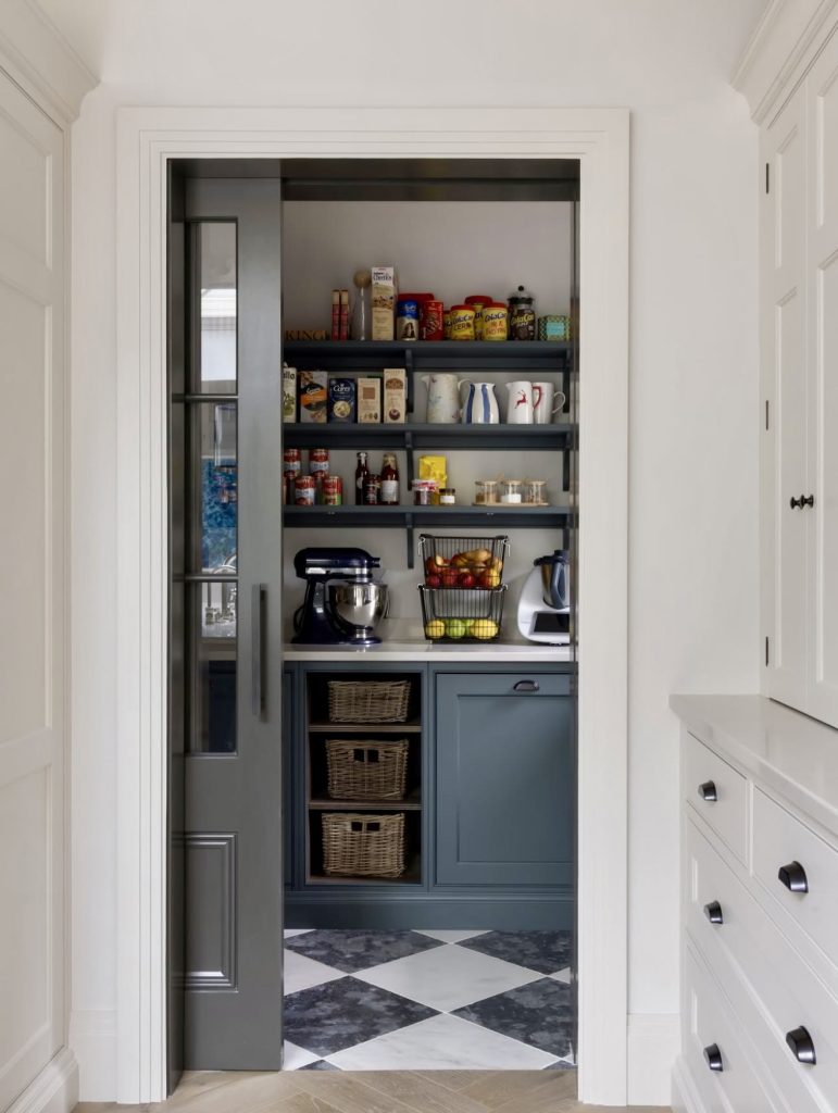 Here, the focus is on the modern organization layout: bold cabinetry in slate tones contrasts beautifully with the checkered flooring. Integrated baskets allow the user to maintain a fluid organization, while upper shelving keeps essentials visible and within reach. Appliance counter provides ample room for mixers, coffee machines, and blenders—quite fitting for those who may want to combine a coffee station right inside the pantry. Studio McGee-type designers always emphasize style and practicality; here is one example that perfectly demonstrates how to maximize organization, even within limited dimensions.