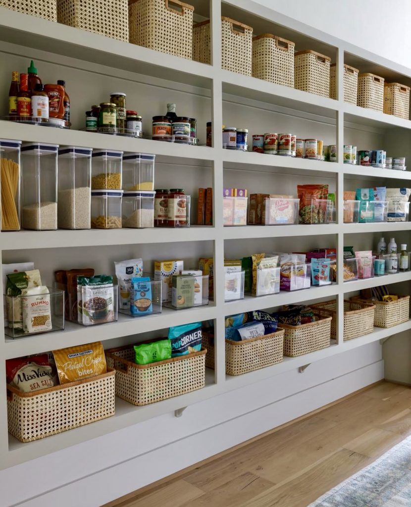 This spacious design highlights shelving organization ideas with rows of neatly arranged baskets and clear bins. Ideal for those who prefer everything visible at a glance, this large walk in pantry feels approachable and highly functional. The woven baskets soften the look, lending a natural aesthetic that works beautifully in both farmhouse and modern kitchens. This style also allows for a flexible system—snacks, cans, and dry goods are all easily sorted. By pairing open shelves with uniform containers, the design encourages a clutter-free environment while still offering personality and warmth.