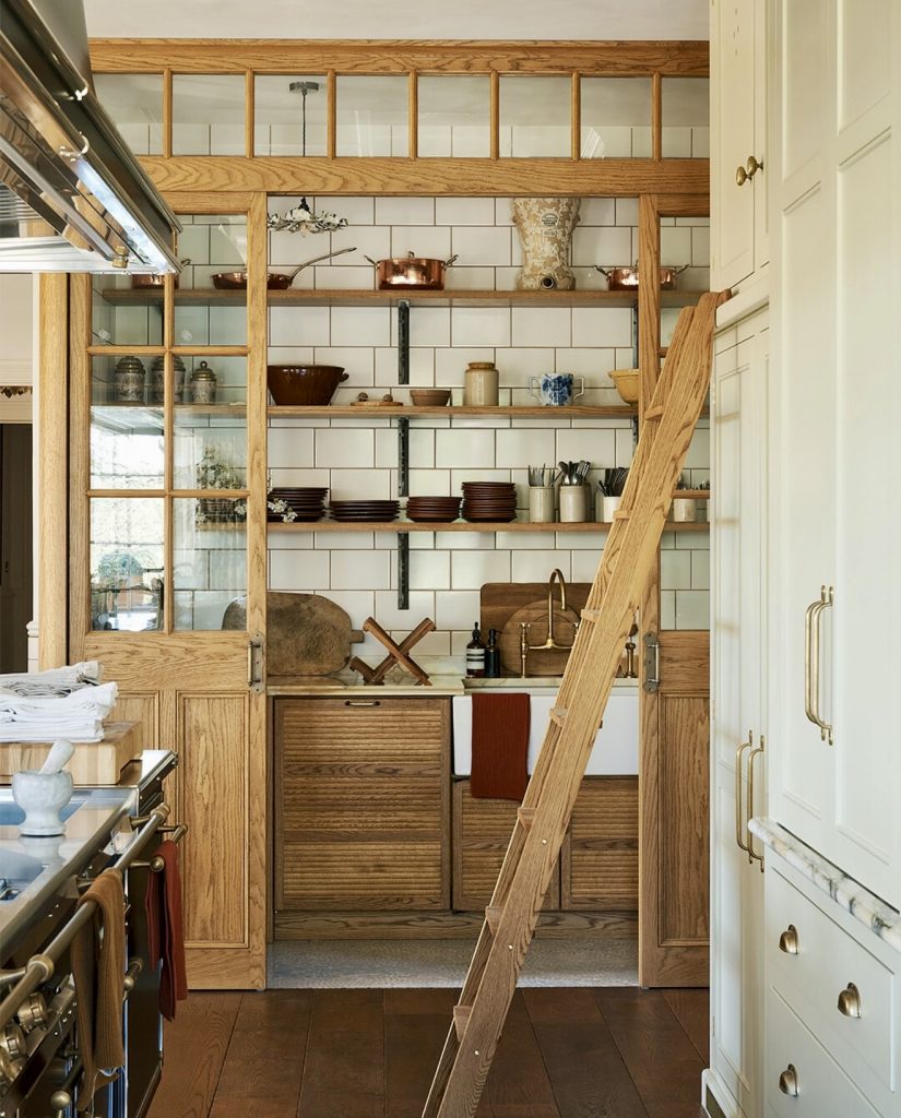 This pantry embraces farmhouse charm with a warm oak-framed entrance and shelving ideas that echo traditional English kitchens. The inclusion of a sliding ladder is both stylish and practical, allowing access to high shelves while adding a nostalgic library-like feel. The layout features tiled walls, open shelving for dishware and copper cookware, and lower cabinets for heavier items. This setup works beautifully as a scullery idea, creating a semi-hidden prep area behind the main kitchen. It’s a space that merges character with function, reminiscent of designs featured in top American home magazines like Architectural Digest.