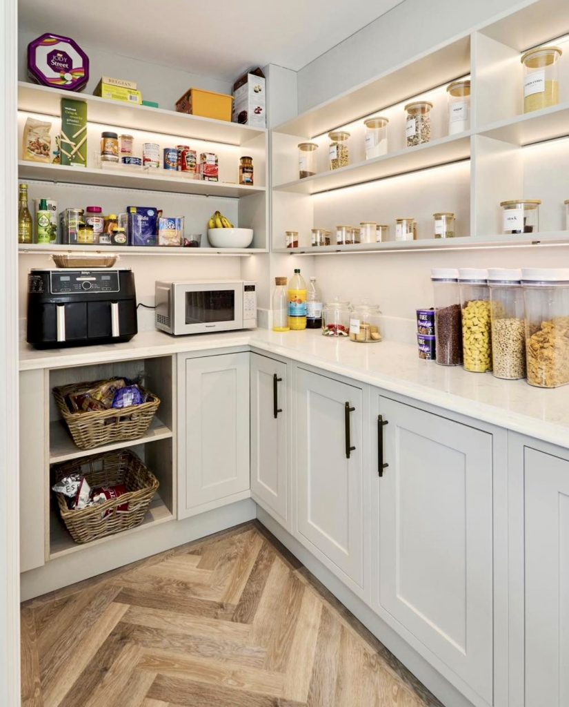 Designed for everyday practicality, this modern pantry focuses on smart organization within a compact footprint. The corner layout maximizes counter space, providing room for small appliances like microwaves and air fryers without overwhelming the kitchen. Backlit shelves illuminate clear storage jars, making it easy to see ingredients at a glance. Lower cabinets with baskets keep snacks and bulky items tucked away neatly. This setup works well in urban homes where efficiency matters, and it’s an excellent example of how tiny pantry ideas can still offer a stylish, functional solution.