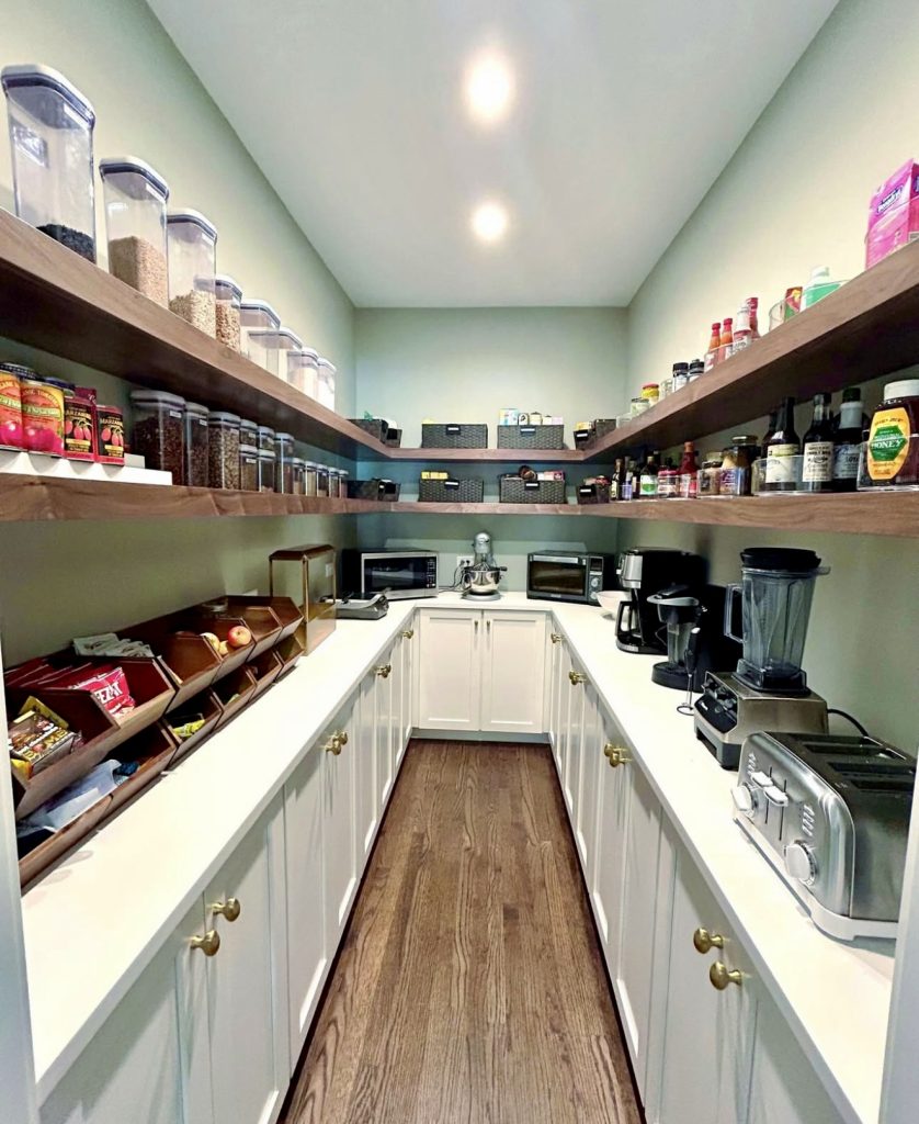 This pantry embodies timeless elegance through its organization ideas and thoughtful layout. Crisp white cabinetry is paired with open shelving to keep ingredients within easy reach, while countertops provide generous prep space and house small appliances like mixers and toasters. The use of baskets beneath the counter ensures clever hidden storage for bulkier items. This modern farmhouse look is ideal for homeowners seeking a space that feels both functional and inviting — proof that a well-planned tiny pantry can feel anything but small.