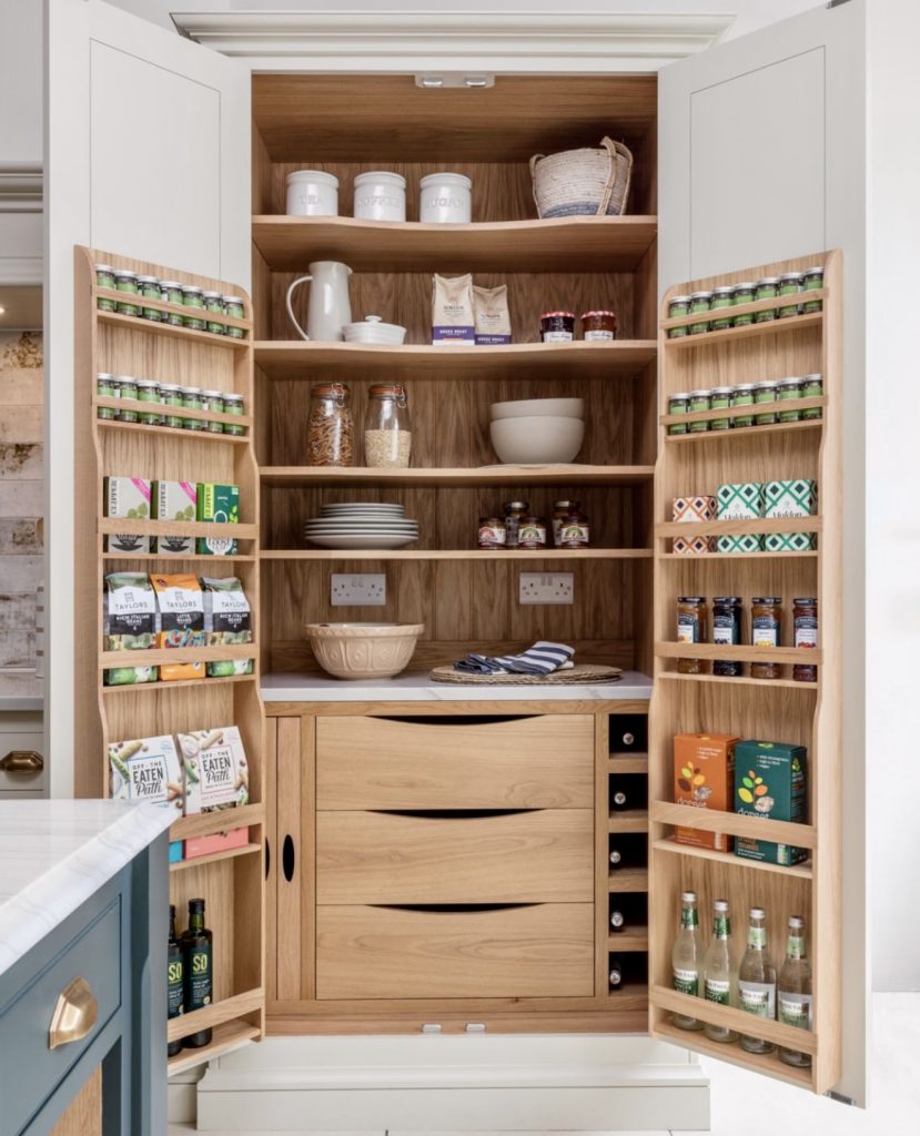 Not every home has the space for a full walk in pantry, and this design proves that cabinet ideas can be just as effective. With shelves built into the doors and drawers below for concealed storage, it offers a highly functional organization system in a modest footprint. The clever use of door shelving makes this pantry feel larger than it is, while the natural wood finish brings warmth and character. This design is especially popular in Ikea-inspired layouts and modern kitchens that value efficiency without sacrificing style.
