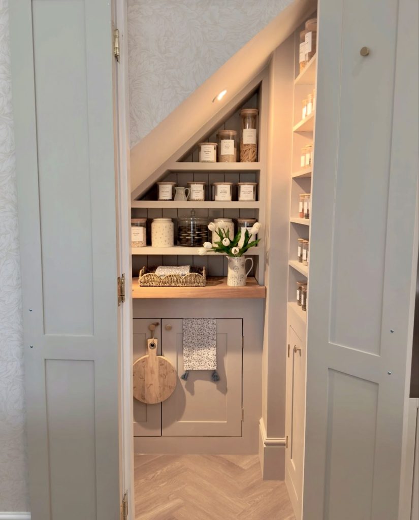 Not all homes allow for sprawling layouts, and this layout demonstrates how to work with a tiny narrow layout under a staircase. Custom shelving is designed to work with the slope, enhancing cabinetry ideas for jars, spices, and snacks. A small countertop adds a touch of functionality without impeding the flow of space-an excellent organizing idea for tighter homes and apartments. This is an Ikea-style pantry hack but done with upscale materials and warm accents. Fresh flowers on the counter add a touch of character, proving that limited space can have style, personality, and functionality.