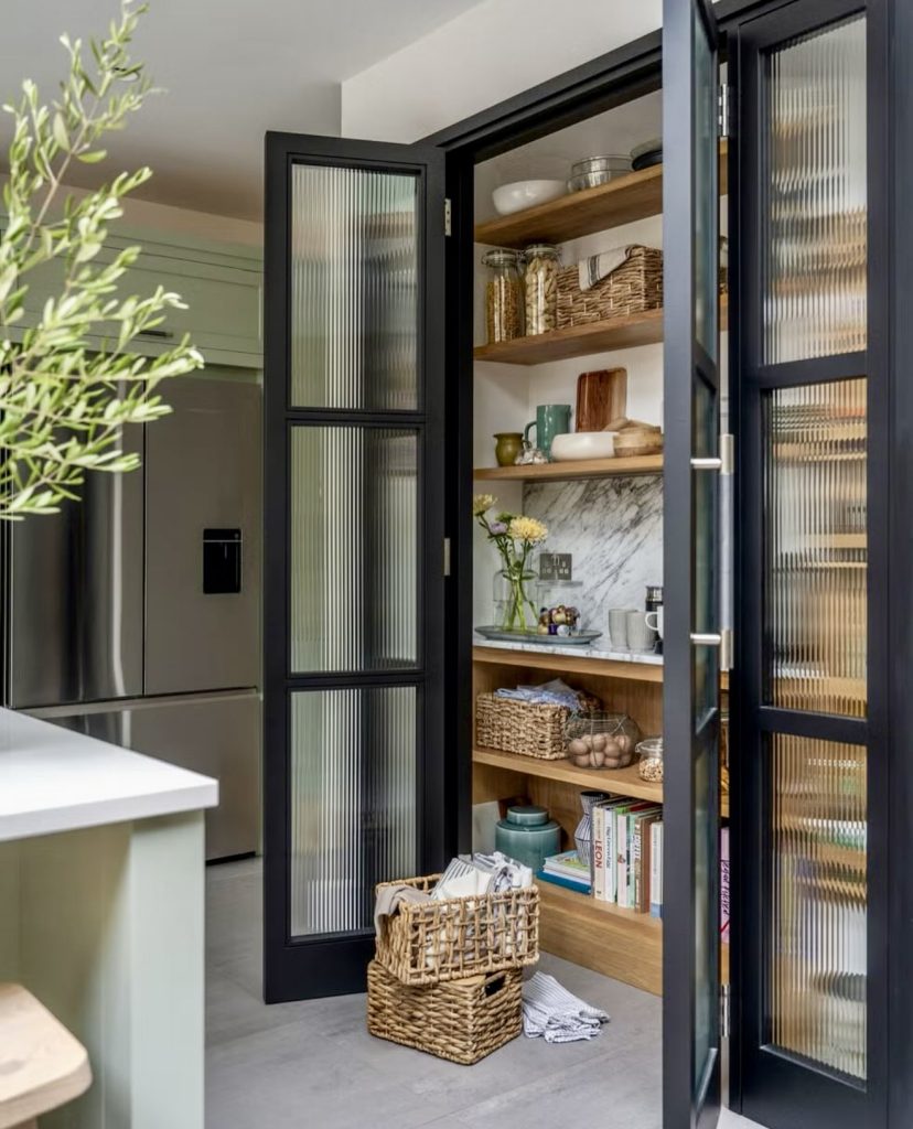 This pantry strikes the perfect balance between modern and rustic by pairing black-framed glass doors with warm wooden shelving ideas. The translucent panels give a glimpse of the pantry’s contents without fully exposing them — a clever way to create a sense of depth in a kitchen with a narrow layout. Inside, the use of woven baskets for organization brings texture and charm, while the marble backsplash on the appliance counter adds a touch of sophistication. This design works beautifully in homes that value both openness and hidden storage zones.