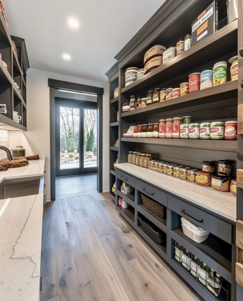 For those who need serious storage, this large walk in pantry with a galley-style layout is a dream. Floor-to-ceiling dark shelving provides ample room for canned goods, dry ingredients, and kitchen essentials, while deep drawers beneath the countertop keep clutter tucked away. The clean lines and integrated lighting make this space feel like a hybrid between a modern scullery and a working pantry. And with a door leading outside, it’s also a practical laundry room combo option — perfect for busy households that multitask.