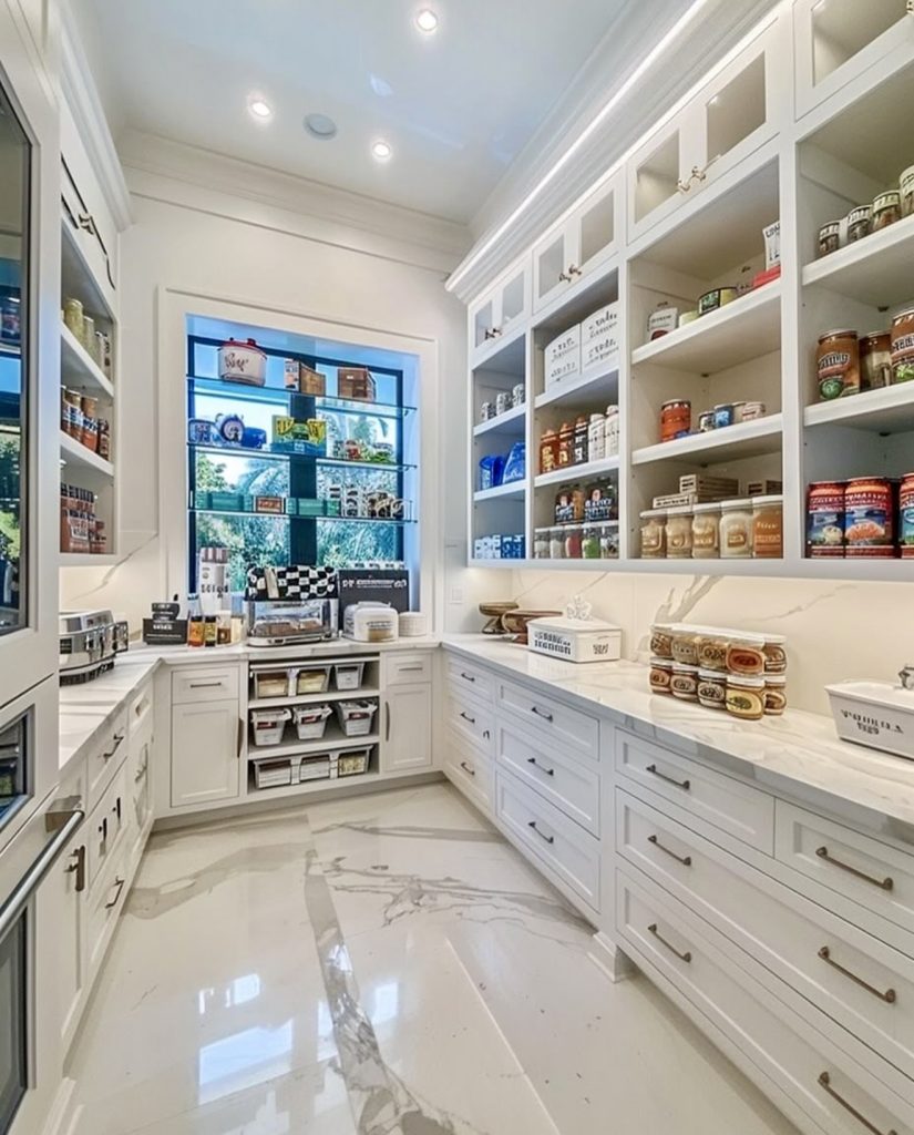This space reimagines the pantry as a luxurious extension of the home. Crisp white cabinet ideas, polished marble countertops, and symmetrical shelving ideas create a sense of order and elegance. The standout feature is the layout with window, which floods the room with light and visually expands the dimensions. Pull-out drawers, open cubbies, and labeled bins make organization ideas simple and efficient. Paired with integrated appliances and a fridge tucked to the side, this design leans into the high-end modern trend seen in many American homes in 2026.