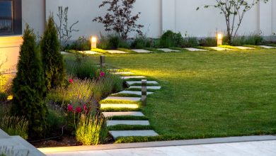 In this garden, solar fixtures line the paths and highlight the lush foliage, demonstrating how outdoor lighting can accentuate nature’s beauty. It’s an illustration of lighting ideas for backyards where functionality meets aesthetics. Here, lights not only guide your steps but also showcase the garden’s nighttime allure, turning a simple dinner outdoors into an enchanting experience.