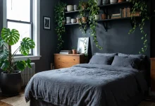 A gray couch in charcoal or warm greige provides the perfect neutral foundation for dark boho styling, allowing accessories and wall colors to shift without requiring furniture replacement. This practical choice works in spaces where you want flexibility to evolve your palette or aren’t ready to commit to colored upholstery. Layer the grey base with jewel-tone pillows, patterned throws, and warm-toned textiles to prevent it from reading cold or corporate. The neutral backdrop actually makes bold decor ideas easier to execute since you’re building from a versatile, timeless starting point.