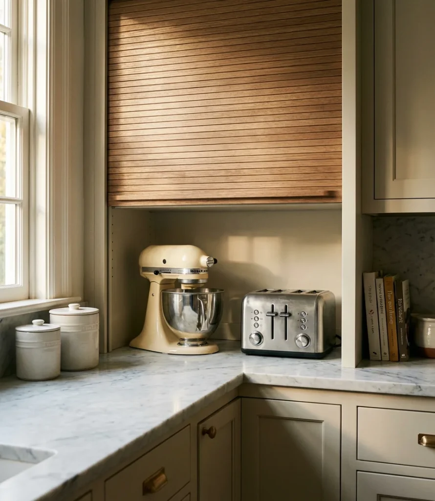 The tambour door mechanism—a series of thin slats that roll up or to the side on a track—is the most popular option because it requires no swing clearance, making it ideal for tight kitchen layouts. They can be finished in wood veneer to match cabinetry, painted to blend seamlessly, or left in a contrasting material as a subtle design detail. Adding appliance garages to a kitchen renovation budget of approximately $15,000–$25,000 is a relatively modest expenditure that significantly enhances daily tidiness. It’s one of those features that people don’t know they love until they have it.