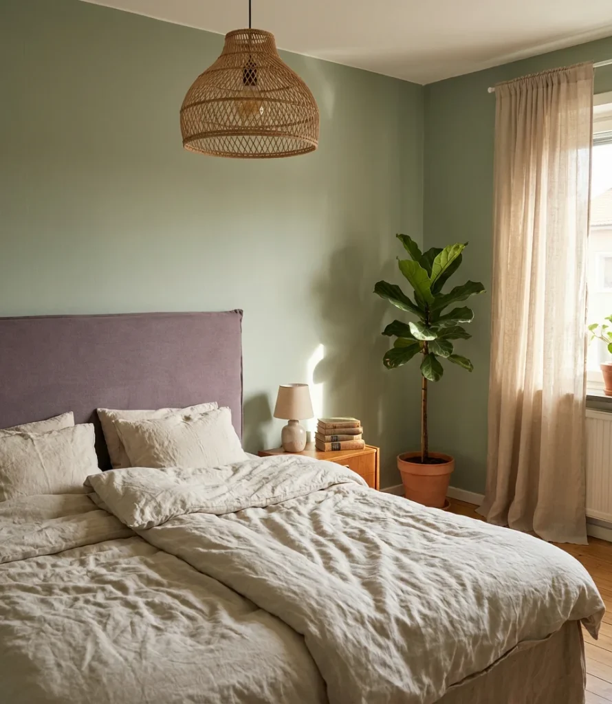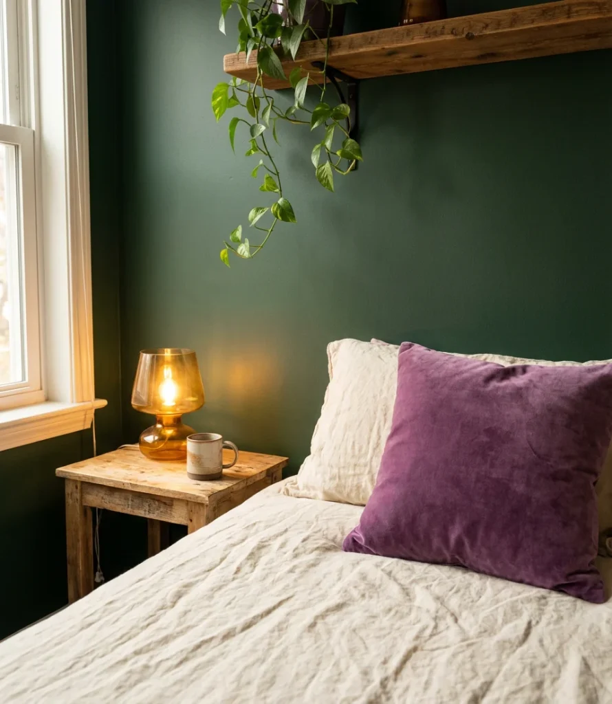 Bring in actual plants to reinforce the palette—a large fiddle-leaf fig or trailing pothos in the corner echoes the green in your walls while adding genuine life to the room. Purple shows up beautifully as an accent in this scheme through throw pillows, a vintage rug, or even a small upholstered chair positioned near a window. Keep larger furniture pieces neutral (warm wood tones, cream upholstery) so the green and purple can breathe. This combination photographs exceptionally well in natural light—your bedside table photo will look genuinely magazine-worthy without any effort.