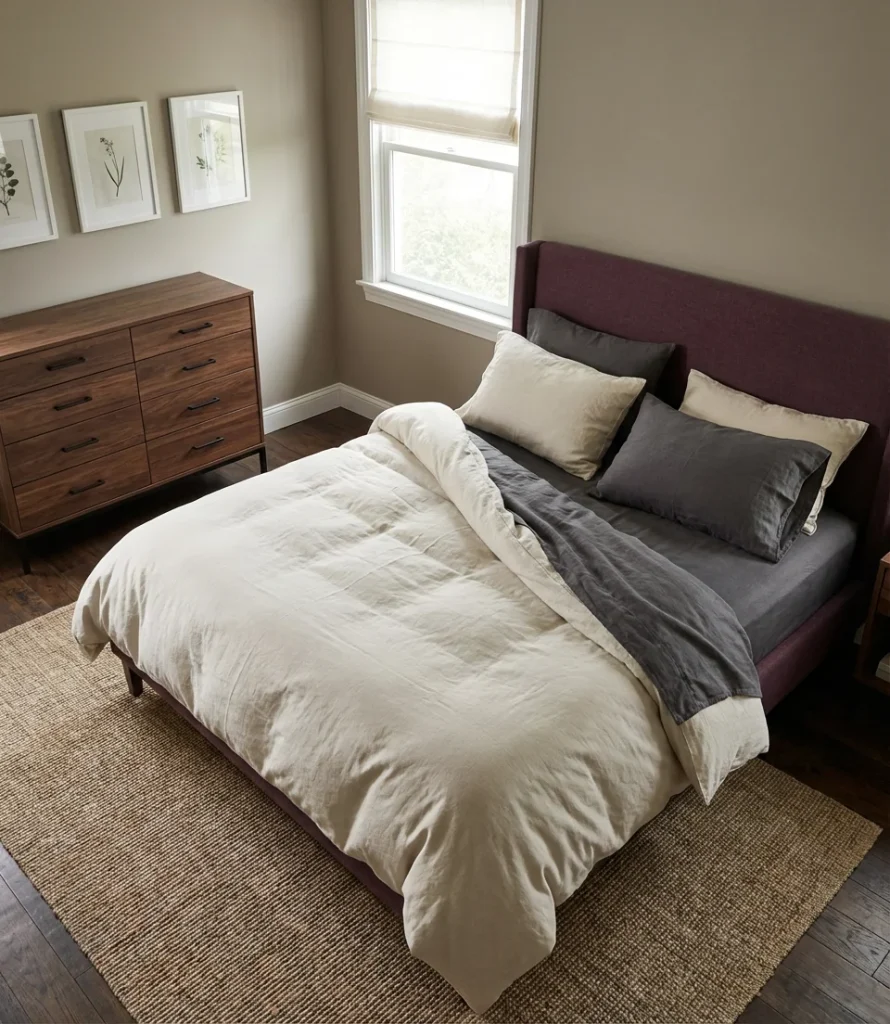 The combination of plum and gray is one of those rare bedroom palettes that manages to feel simultaneously contemporary and enduring. Cool charcoal gray walls with plum accents, or warm greige with a rich plum headboard and throw—both versions share the same quality of quiet confidence. This is a genuinely grown-up palette, for adults and for couples who want a bedroom that will still feel right in ten years without looking dated. There’s no trend chasing here—just an elegant understanding of how complementary tones create visual depth and warmth when combined with genuine care.