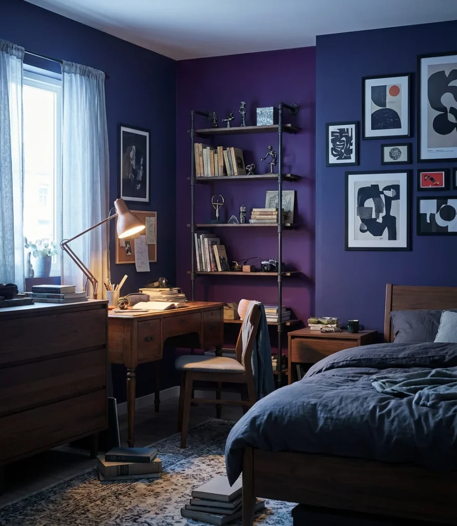 Purple doesn’t belong to any gender, and in 2026, that reality is finally showing up fully in bedroom design. A purple bedroom for a teen boy built around deeper, more saturated tones—think indigo-purple, eggplant, or smoky violet—reads as bold and confident rather than anything else. Pair it with industrial metal accents, dark wood furniture, and graphic art, and you have a bedroom that a teenage boy will genuinely want. The aesthetic here borrows from music studios, gaming setups, and street art—it’s aspirational and cool in a way that transcends any color association.