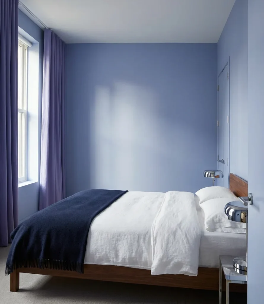 Purple and blue sit close enough on the color wheel that they could easily blur into one another—but when handled with intention, the combination creates a bedroom that feels coolly sophisticated and genuinely interesting. Dark blue as an accent against medium purple walls, or vice versa, produces a layered effect that rewards a second look. Navy bedding on lavender walls, for example, reads as almost editorial. This is a palette that works especially well for adults who want color without warmth—a bedroom that feels crisp, calm, and a little cerebral rather than cozy and enveloping.