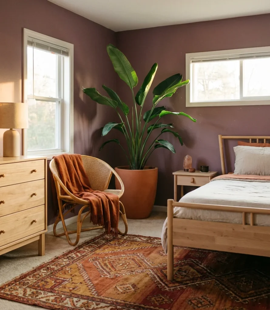 Anchor this palette with natural materials—terracotta pots, rattan baskets, raw wood furniture—which soften the vibrancy of both colors and keep the room from feeling artificially saturated. A jute or kilim rug in orange, rust, and purple tones is often the single piece that brings the whole room together, providing a layered reference point for every other color decision in the space. Introduce orange through plants as well: a large bird of paradise or several terracotta planters add botanical warmth that reinforces the palette without adding visual clutter.