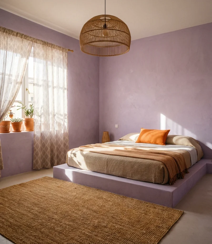 Purple and orange is a combination that design-forward homeowners are just beginning to explore seriously, and the results are striking. Burnt orange and deep plum create a sunset palette that feels warm, maximalist, and completely unexpected in a bedroom. Tangerine and soft lilac, on the other hand, achieve something altogether different: bright, playful, and almost Moroccan in its cheerfulness. Cute without being childish, this palette works well for adults who want their bedroom to reflect a genuinely individual taste rather than following any prevailing trend.