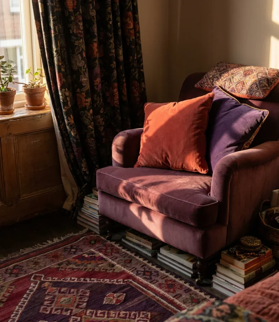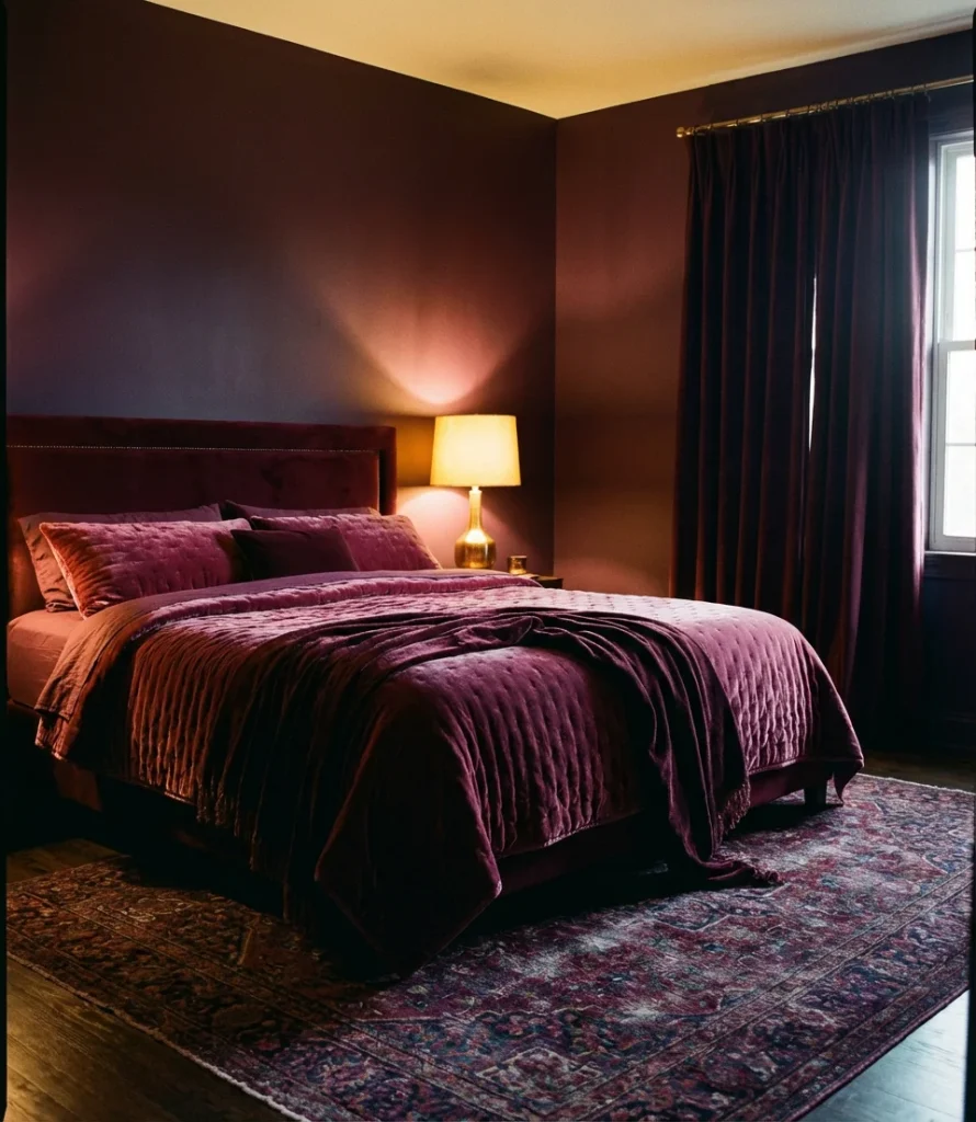 This look works best when the room has architectural detail to showcase—crown molding, a fireplace, built-in shelving, or a bay window. Without structural interest, very saturated rooms can feel oppressive. If your bedroom is relatively plain architecturally, lean toward the more muted versions of both colors (dusty rose-red, smoky plum) and allow texture to carry the drama instead. Rich velvet curtains, a patterned vintage rug, and layered bedding in the same family of jewel tones will create a maximalist interior that feels collected over time rather than executed all at once.