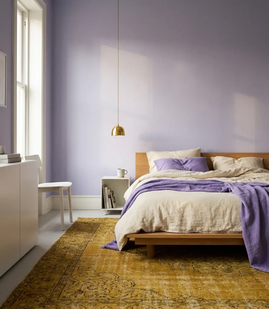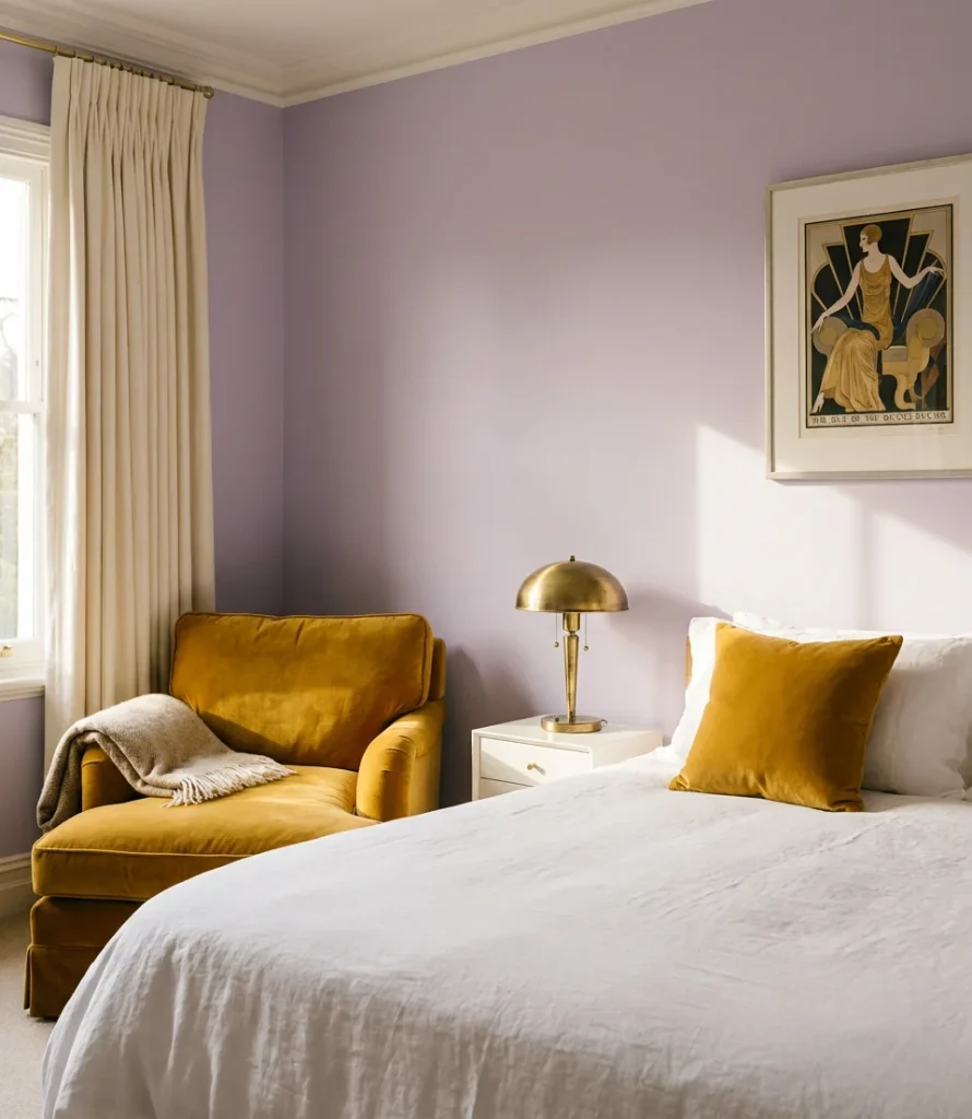 Purple and yellow are the original color wheel opposites—bold, graphic, and full of energy when placed together. In a bedroom context, the secret is tempering both tones dramatically: soft lavender walls with warm mustard yellow accents, or pale butter-yellow walls anchored by a deep violet rug and throw. The combination has a distinctly European art deco quality that feels increasingly relevant in 2026. For teens’ lavender bedrooms especially, this palette hits a sweet spot between playful and grown-up that’s genuinely hard to achieve with more conventional color choices.
