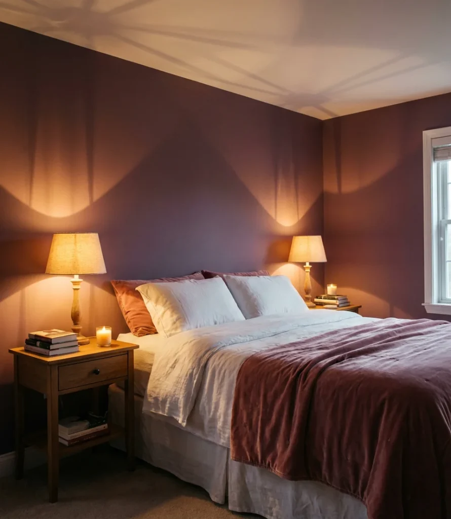 A well-executed moody bedroom requires thoughtful lighting—this is where most people go wrong. Dark walls absorb light aggressively, so you need multiple warm light sources positioned at different heights. Think: a statement pendant, bedside sconces, and a floor lamp tucked in a corner. Avoid cold-toned LED bulbs at all costs; they’ll make your carefully chosen plum wall look flat and slightly clinical. Warm bulbs in the 2700K range will bring out the richness in the color and make the space feel genuinely enveloping rather than just dark.