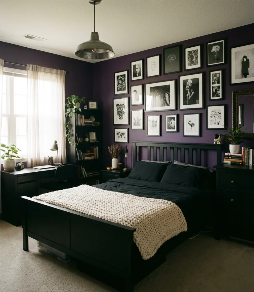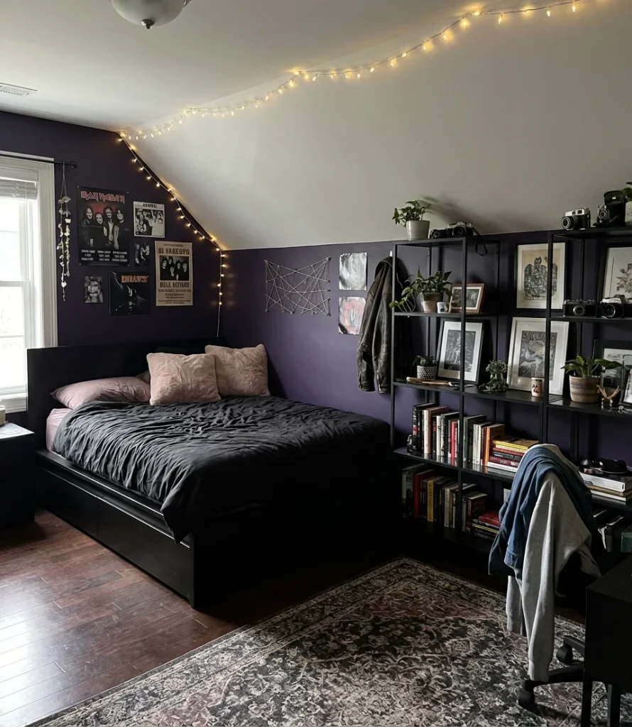 This combination works best in rooms with at least one good natural light source—a window that gets morning or afternoon sun will prevent the space from feeling oppressive. If your teen’s room faces north or gets limited daylight, consider keeping the ceiling white and using the purple-black palette only on the lower two-thirds of the walls and in the furniture. That approach maintains the dramatic energy while ensuring the room doesn’t feel like a cave. String lights or a neon sign (kept minimal) can also add warmth without undermining the overall vibe.