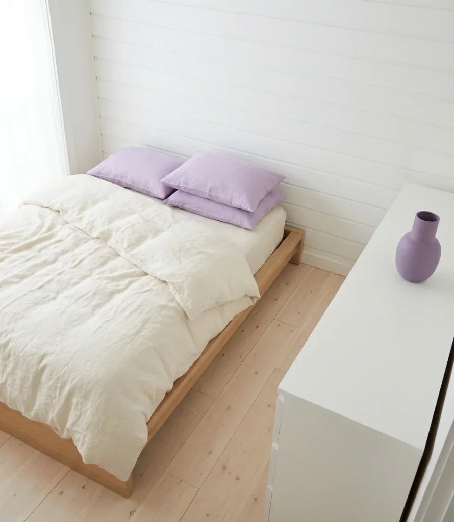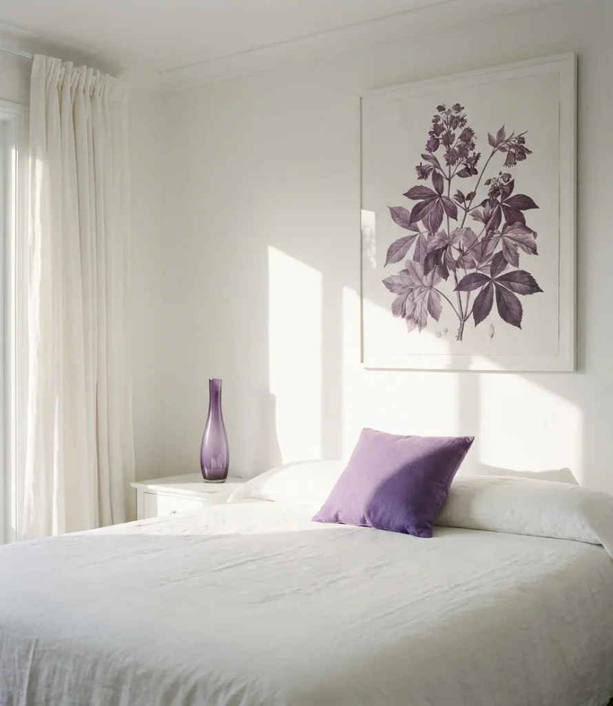 Material quality truly shines in the white-and-purple bedroom. When there’s little color to carry the room, texture and finish quality become the primary design tools. Invest in a duvet cover with a genuine thread count, choose window treatments with clean, tailored lines, and make sure your white walls are actually bright and unmarked—scuffs and yellowing will show aggressively in this clean palette. A single large piece of purple-toned botanical art above the bed can anchor the whole room, doing the work of an accent wall without a drop of paint and with far more personality.