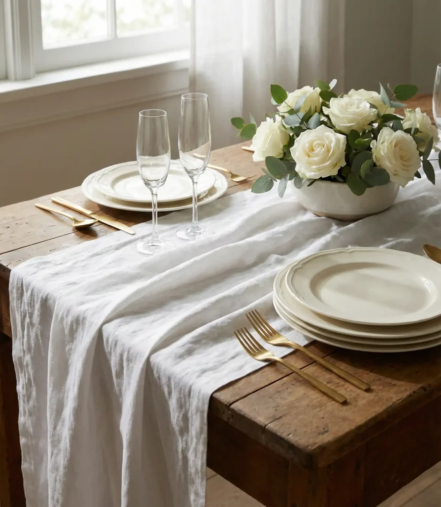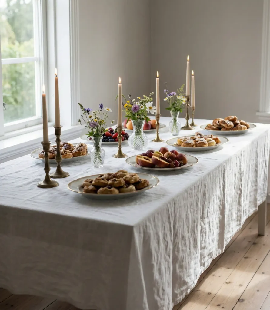 A pristine white tablecloth sets the stage for sophistication, especially when paired with elegant gold-rimmed serving dishes and candlesticks. This approach works beautifully for wedding receptions, milestone anniversaries, or upscale dinner parties where you want to convey timeless grace. Layering textures—think embroidered runners or delicate lace overlays—adds depth without overwhelming the clean palette.