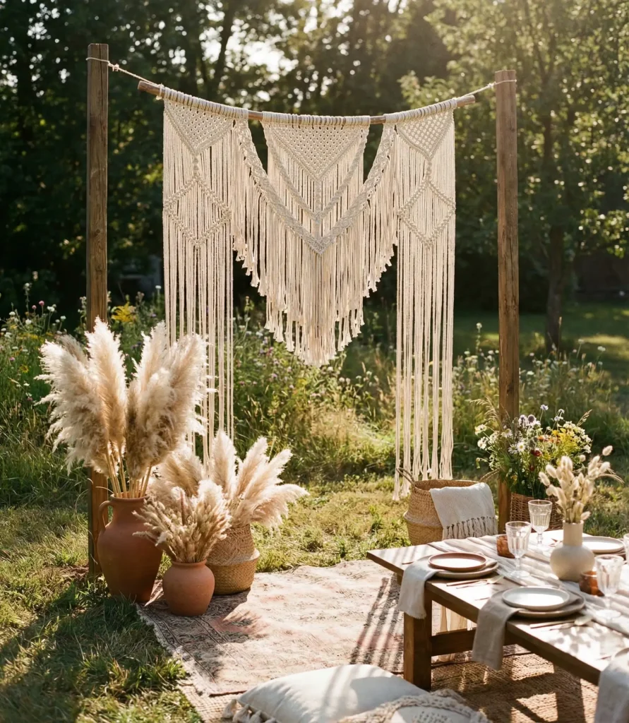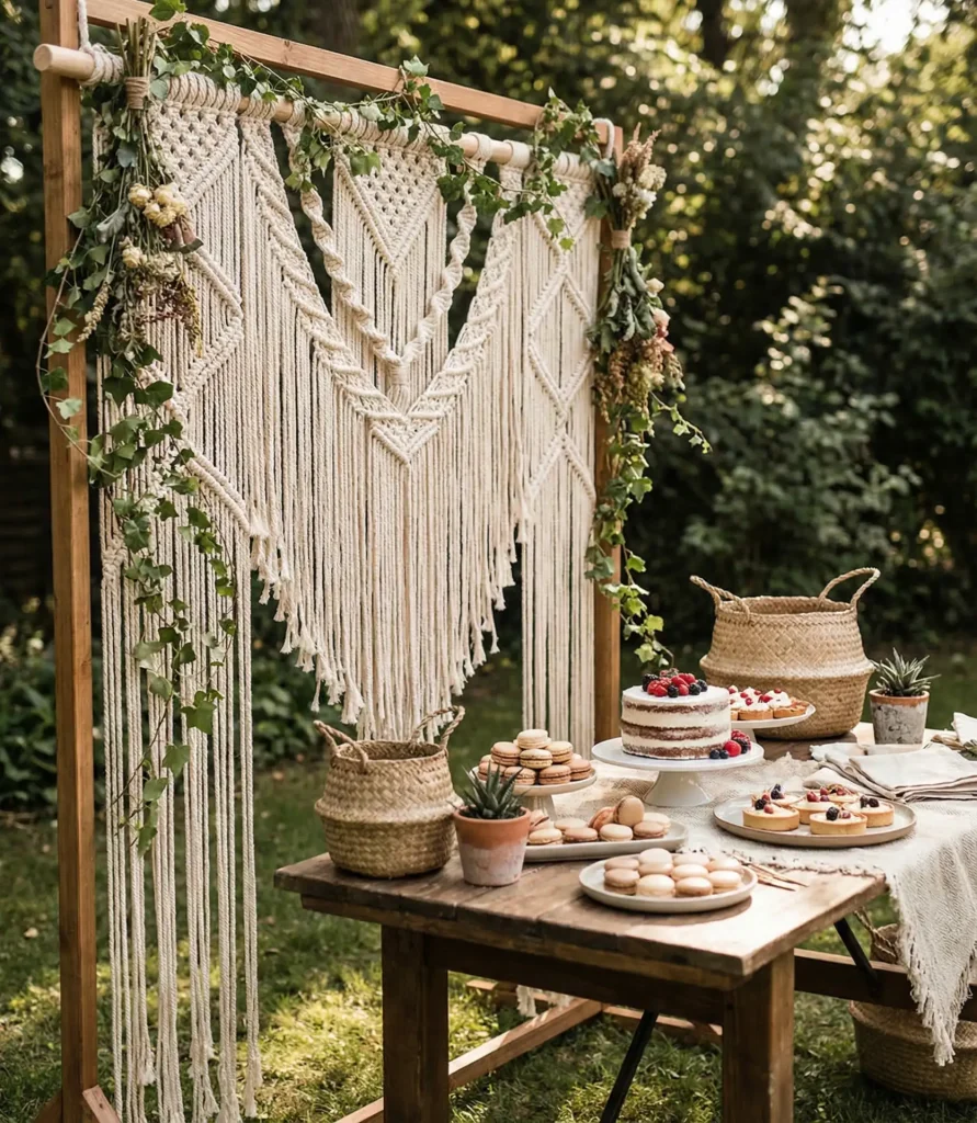 Make a beautiful, moderately boho macramé wall by hanging the center of attention between two posts or trees. This immediately grounds your party area and serves as a beautiful location for photos, food displays, or even a dessert table. Combine it with other textural elements like pampas grass, dried palm fronds, or trailing greenery for a layered look that feels both rustic and sophisticated.