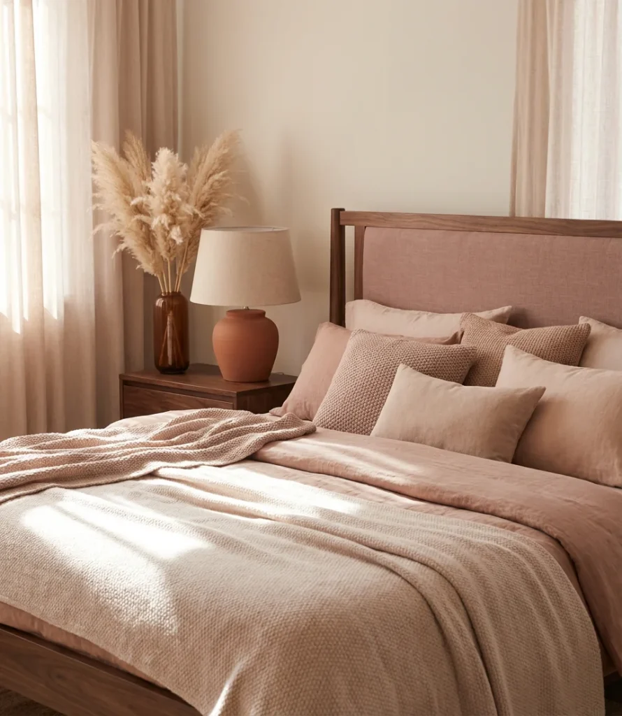 Where this design works best: primary bedrooms in homes where the overall vibe leans eclectic or vintage-influenced. Using this palette in very modern, angular spaces can be challenging, as it demands curves, soft textures, and a hint of romantic disorder. Practically speaking, you don’t need to repaint. Start with blush pillow covers and a terracotta throw on an existing brown or walnut bed frame, and you’ll have your answer within a weekend about whether this direction feels right for your space before committing to anything permanent.