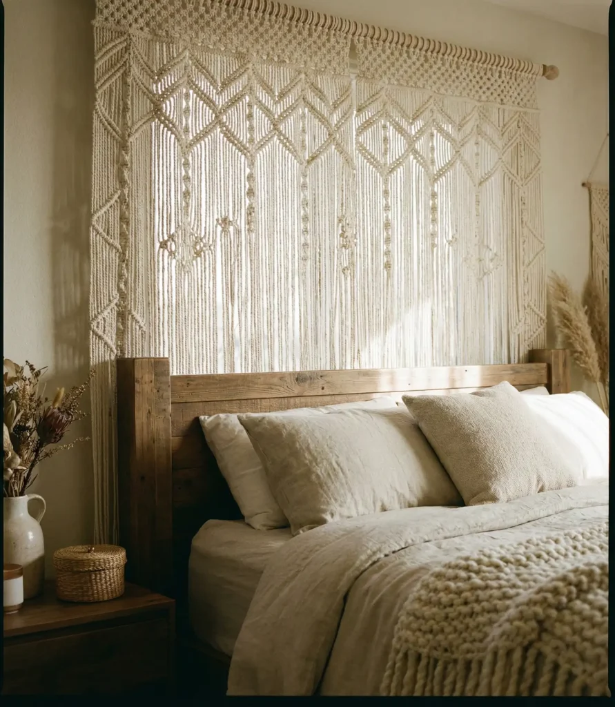 Placing curtains behind the bed rather than at windows has become a signature boho move, adding texture and dimension to blank walls. Macramé or lightweight woven panels create a soft, artful backdrop that frames the bed like a headboard. This approach works beautifully in bedrooms with minimal architectural interest or when you want to introduce patterns without committing to wallpaper. The handcrafted feel aligns perfectly with the current embrace of artisan details.