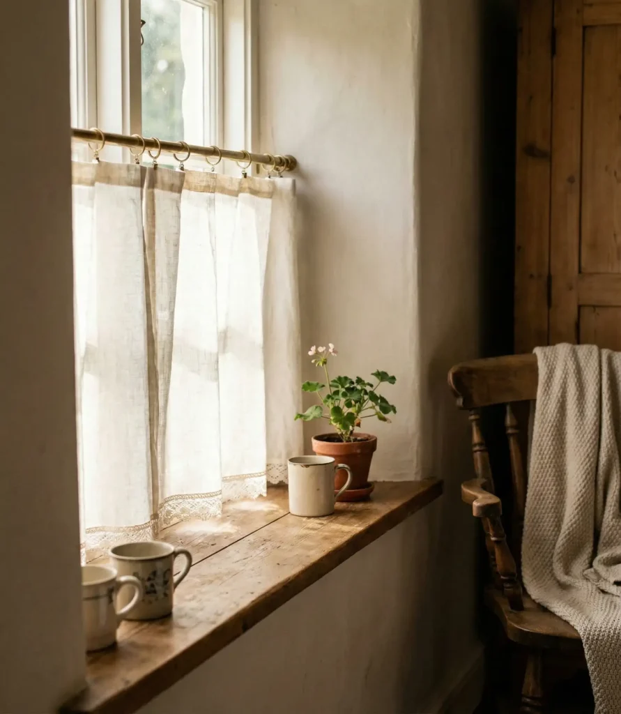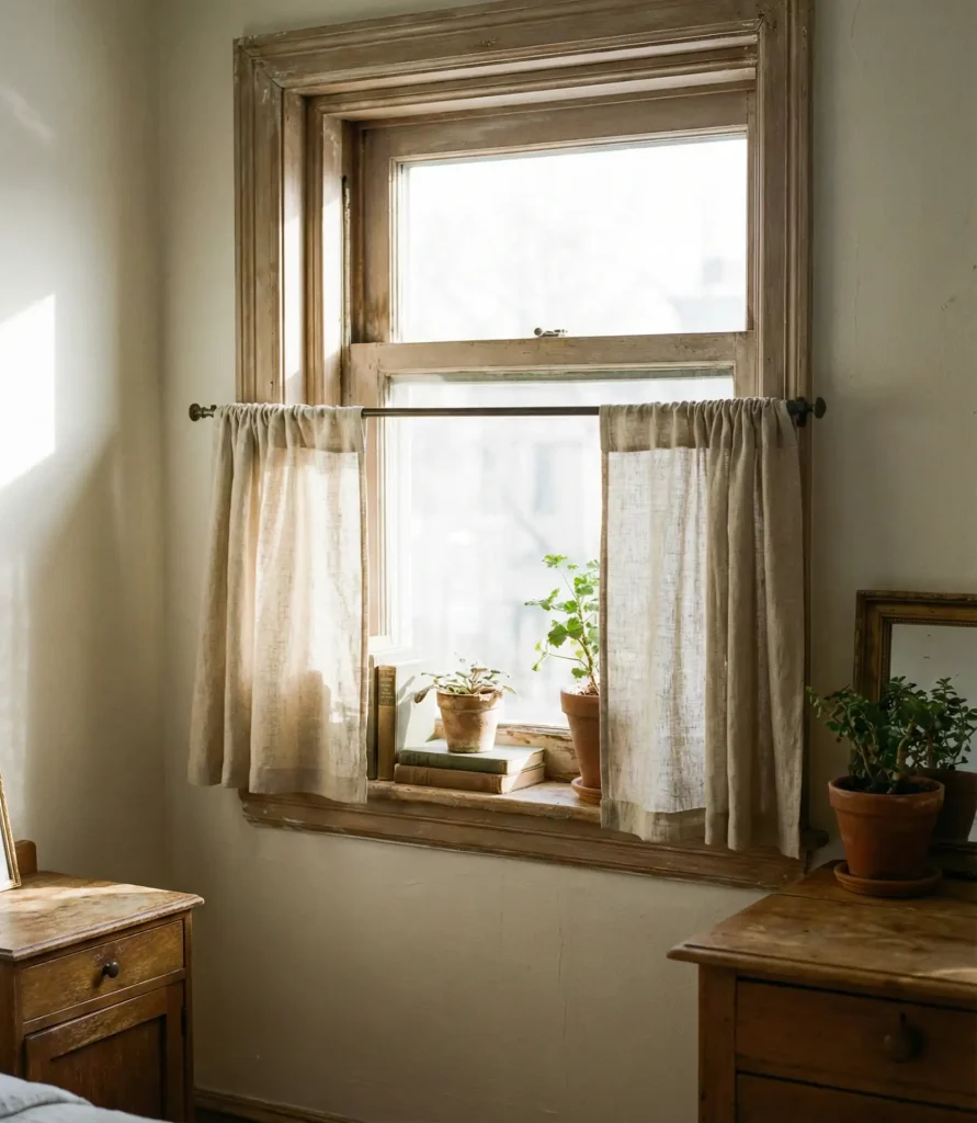 Where it works best: in older homes with multiple small windows, cottage bedrooms, or apartments where ceiling height is limited and you want to avoid visual clutter. Café curtains cost significantly less than full panels—expect to spend $20–$40 per window—and they’re easy to DIY if you’re handy with a sewing machine. Tension rods make installation renter-friendly and damage-free.