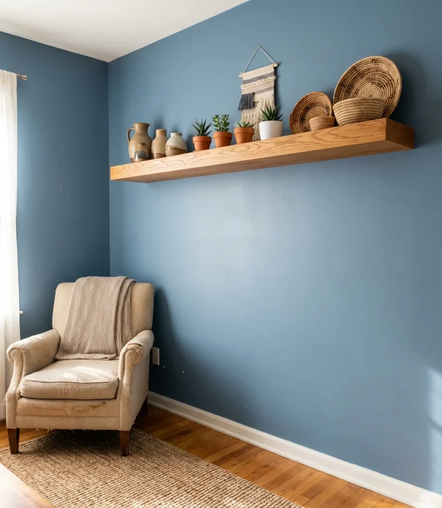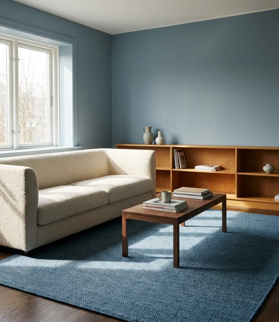 An interior designer based in Portland, Oregon, describes this palette as “the answer to everyone who got tired of all-grey interiors but wasn’t ready for a full commitment to color.” The warmth of the wood prevents the blue from reading cold, and the blue keeps the wood from feeling too rustic. For a budget-friendly version of this look, IKEA’s warm-toned wood pieces pair surprisingly well with mid-range wall paints in the blue-grey family—Sherwin-Williams’ “Rainwashed” is a particularly strong match.
