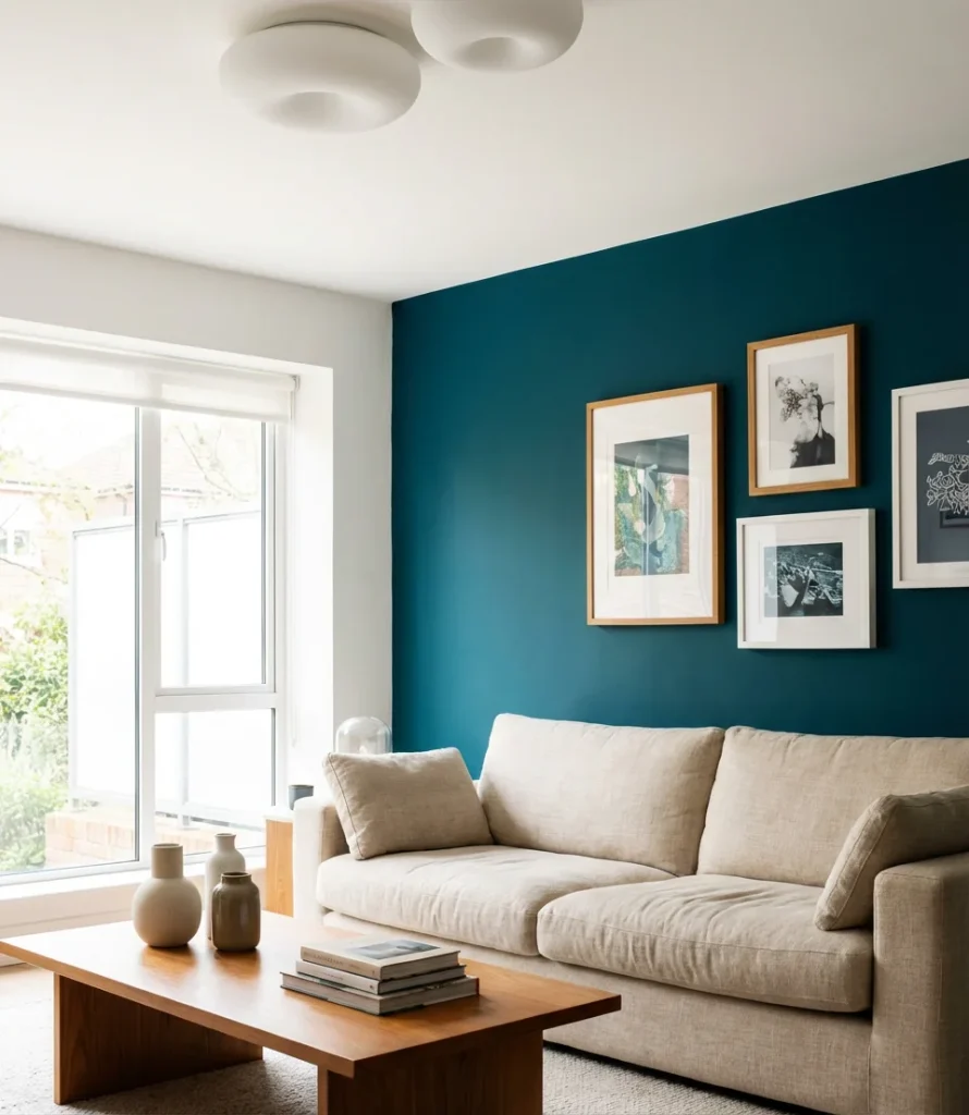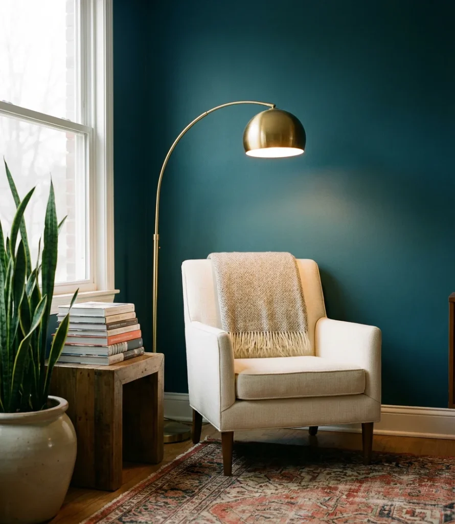 Behr’s “Pressed Fern” and “Spiced Teal” are two specific options that have developed dedicated followings among the DIY renovation community online. One homeowner documented her teal accent wall transformation on a home blog—total project cost was $58 for paint and supplies, and the room was transformed in a single Saturday afternoon. Teal works best in living rooms that also receive warm artificial lighting in the evenings, which brings out the green undertones and keeps the room from reading too cool.