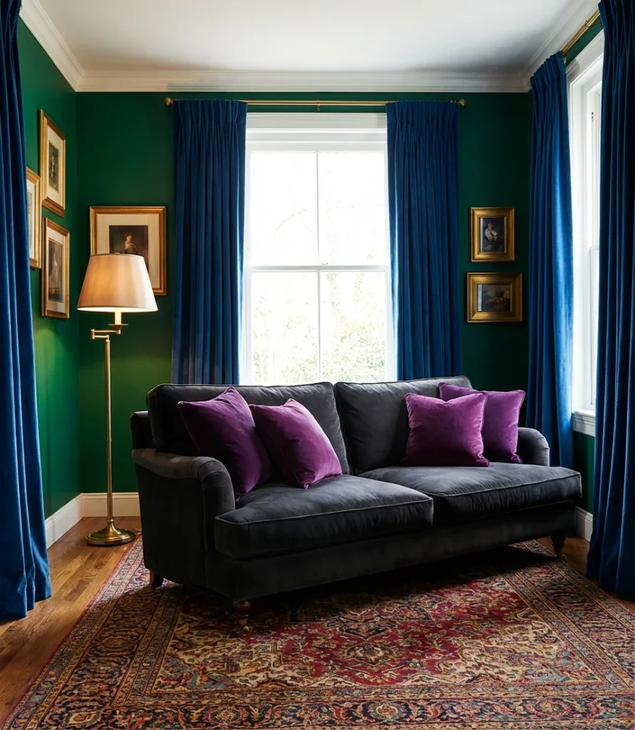 Going bold doesn’t have to mean going monochromatic—in fact, some of the most stunning living rooms of 2026 are mixing jewel tones across every surface, from emerald walls to sapphire curtains and amethyst throw pillows. This bright multi-hue approach works because jewel tones are all deeply saturated; they’re related in terms of intensity even when they differ wildly in hue, giving the room a cohesive richness.