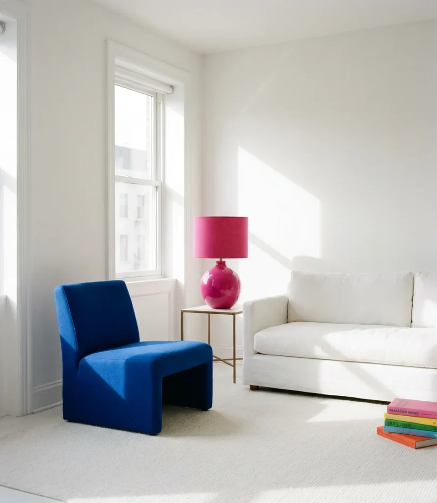 A bright white room is often the safest choice—but in 2026, the most exciting version of this look deploys small, unexpected doses of color in unusual places. A fuchsia lampshade. A cobalt blue side chair completes the ensemble. The room features a single deep forest-green picture frame. The white background serves as a quiet stage, while each colorful accent acts as a performer. This technique is the inspirational approach that keeps white rooms from feeling cold or generic.