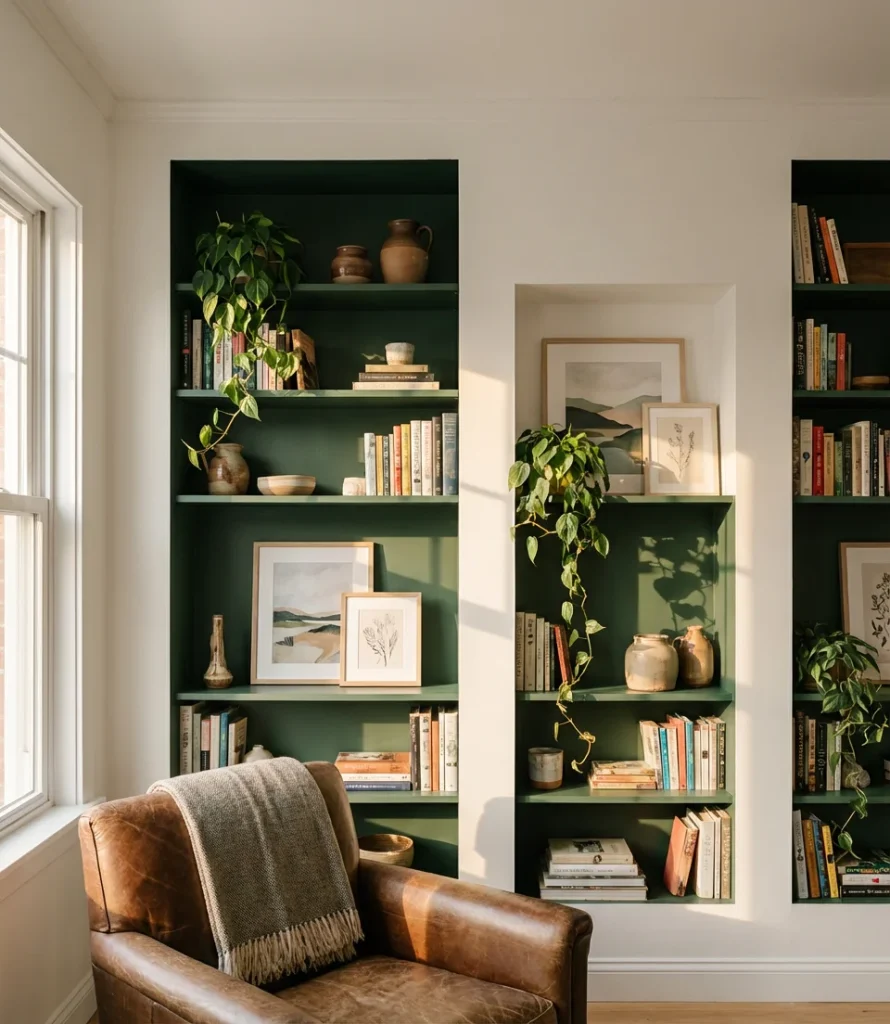 Painting built-in shelving a contrasting color to the walls is one of the smartest interior moves in a colorful living room—it turns functional storage into a genuine aesthetic statement. Imagine dove grey walls with forest green built-ins, or a cream room with terracotta-painted shelving. The shelves transform into a self-contained gallery, amplifying the impact of the carefully chosen objects set against the vibrant pop of color.