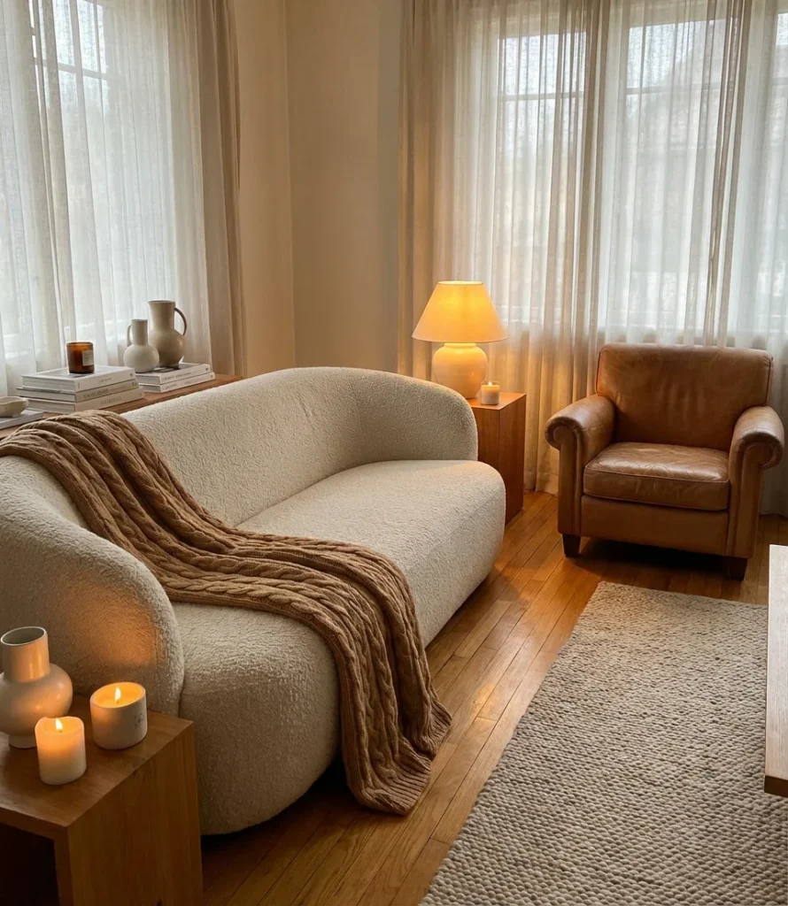 This look performs particularly well in mountain towns and colder climates—think Bozeman, Montana, or Bend, Oregon—where people genuinely want their homes to function as warm retreats. It’s also a smart choice for open-plan homes because the tonal consistency helps the eye flow easily from kitchen to living area without abrupt breaks. Budget-conscious tip: cream and caramel tones are widely available at every price point, and thrift stores are excellent sources for caramel leather and warm-toned wood pieces.