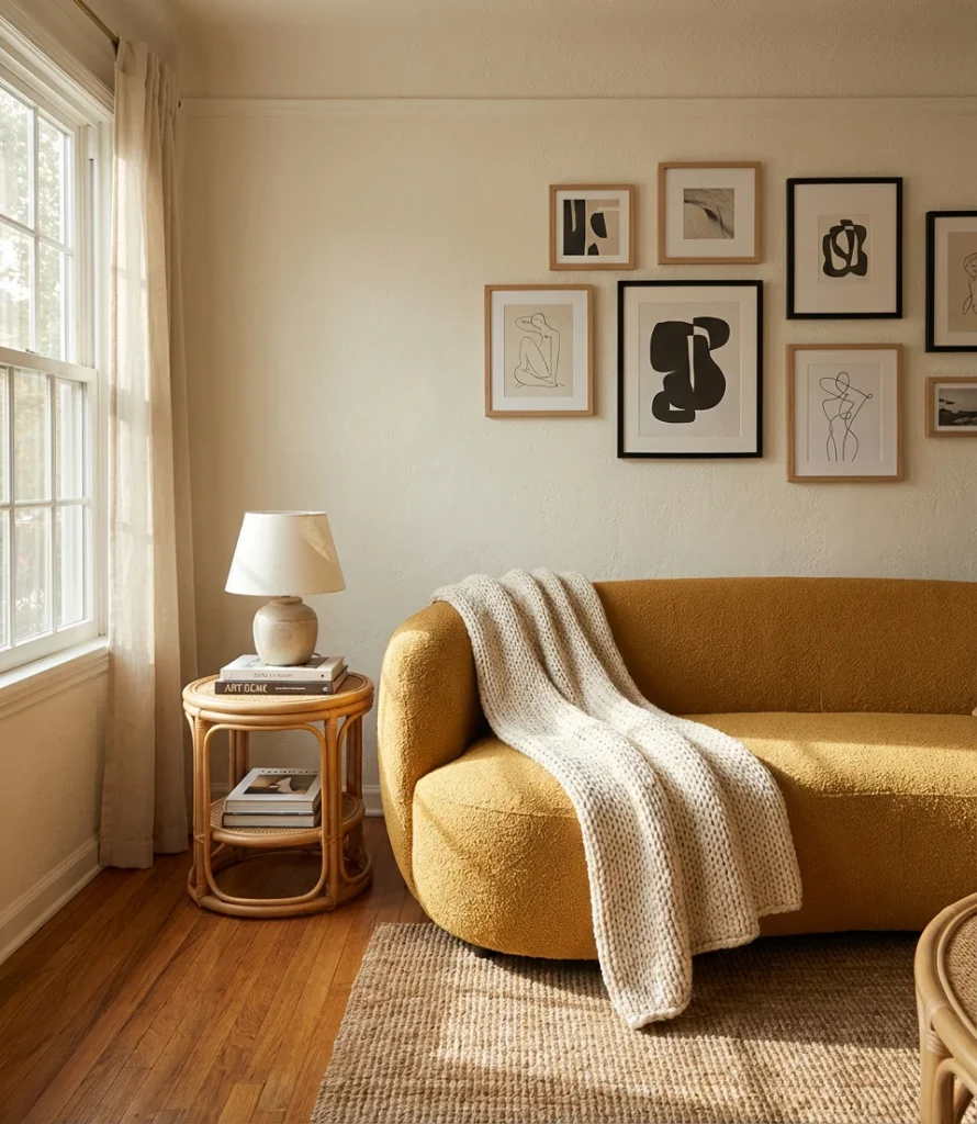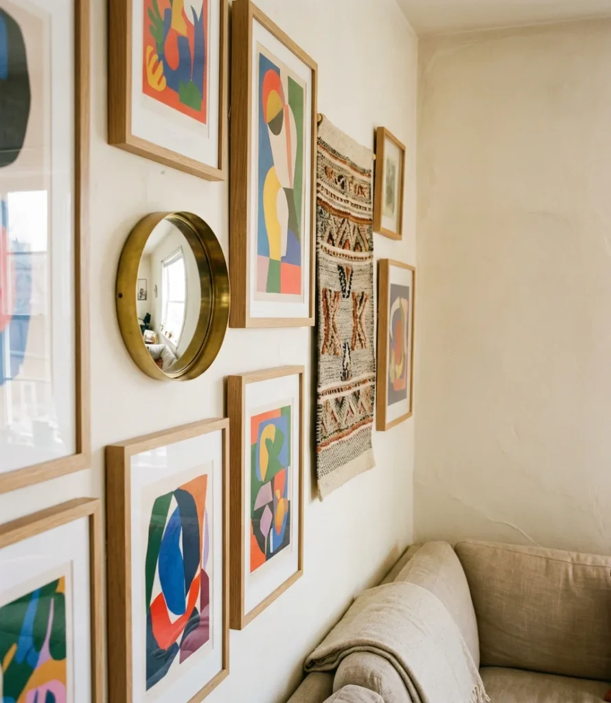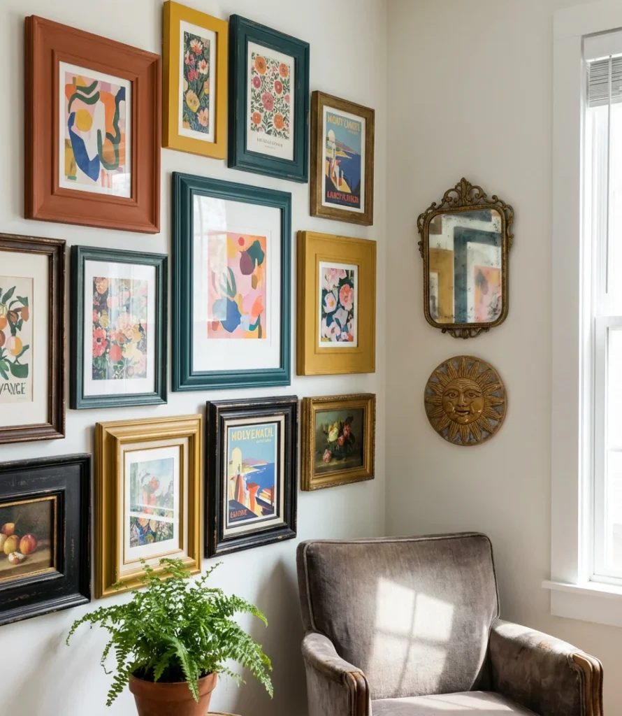 A gallery wall that embraces color—mixing colorful frames, vibrant prints, and boldly toned objects—is one of the most eclectic and personally expressive things you can do in a living room. Unlike the all-white-frame gallery wall that dominated the mid-2010s, the 2026 version is richer, more playful, and deeply individual. Bold color choices in the frames themselves—rust, teal, and mustard—turn the gallery from decoration into an art installation.