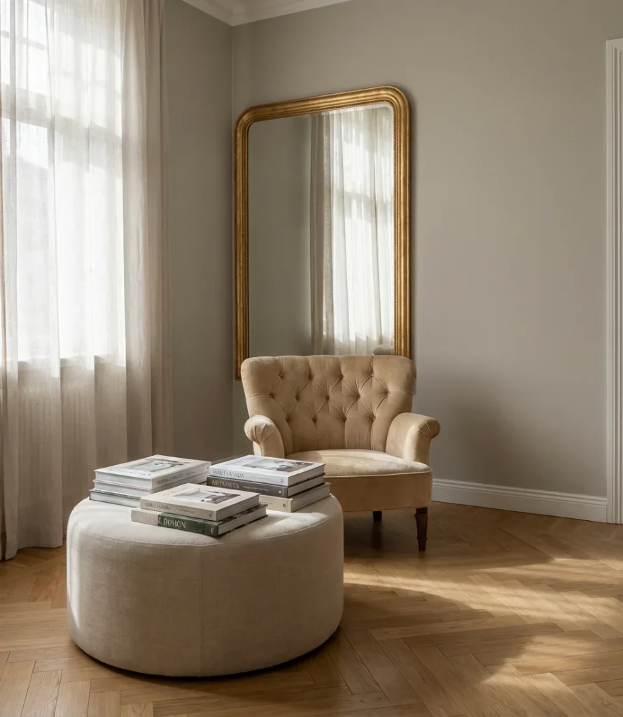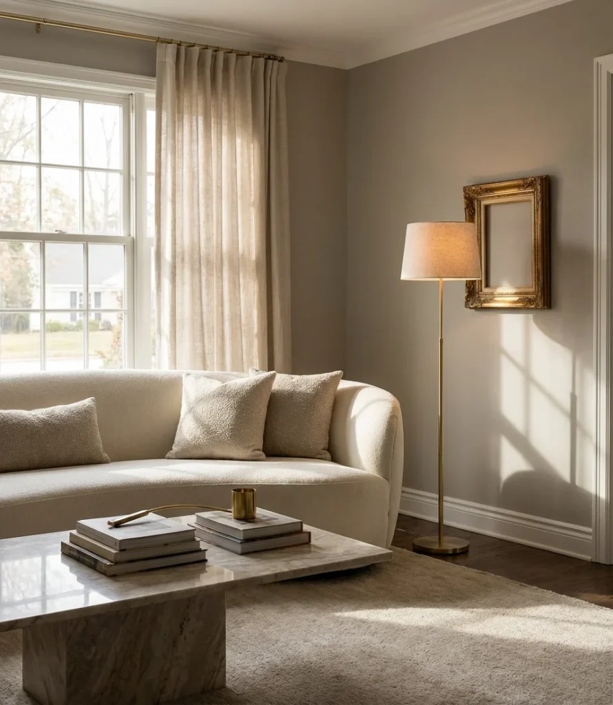 Greige paint—that perfect hybrid of grey and beige—has cemented itself as the elevated neutral of the decade. It’s warmer than grey, cooler than beige, and sophisticated enough to anchor a living room that wants to feel expensive without looking sterile. Paired with gold accents (light fixtures, picture frames, hardware), a greige base becomes a genuinely glamorous backdrop that works across styles from transitional to contemporary.