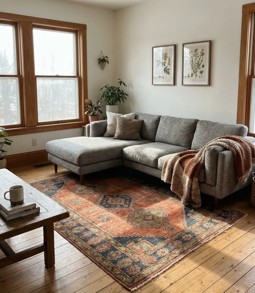A gray couch is the blank canvas that millions of American living rooms are already working with—and a vibrant, pattern-rich rug underneath it is the single fastest way to inject color and personality without buying new furniture. In 2026, the most-pinned versions of this combo feature vintage Moroccan rugs, bold geometric kilims, and hand-tufted florals in jewel tones that completely transform the room’s energy.