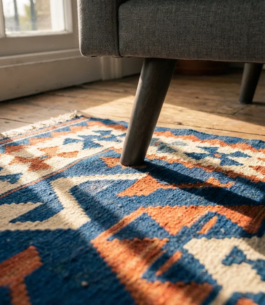 The grey-sofa-colorful-rug formula works because the grey acts as a visual anchor, preventing the rug’s pattern from overwhelming the room. One common mistake: choosing a rug that’s too small. The front legs of all major seating should sit on the rug—for a typical sofa and two chairs, that usually means at least an 8×10 or 9×12. Rugs from Ruggable, eSaleRugs, and vintage platforms like Oaxacan Textile often deliver the most visual impact at mid-range price points.