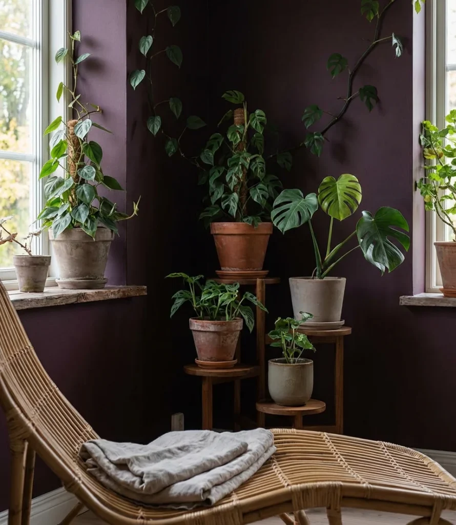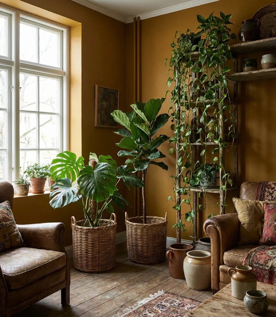 The living room as a plant sanctuary is a fully established lifestyle category now, and the most visually compelling versions layer lush greenery against a deliberately colorful backdrop. Indoor paint in warm ochre, rust, or deep plum makes plant leaves practically pop off the wall. The contrast between living, breathing green and saturated painted surfaces creates a dynamic tension that photographs beautifully and feels genuinely joyful to live in.