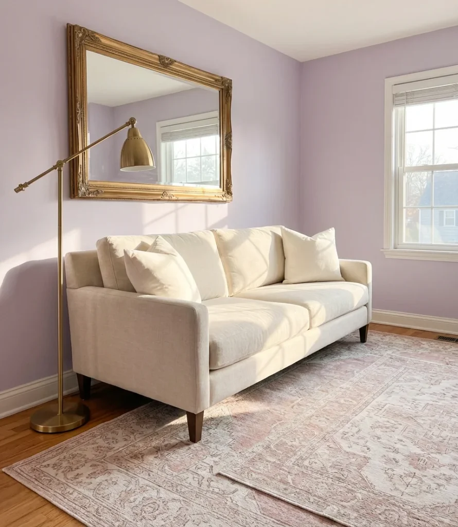 Lavender isn’t just for bedrooms anymore—as an accent wall in the living room or a full-room color, it delivers a kind of soft, unexpected elegance that neutral rooms simply can’t achieve. Paired with gold and warm brass tones, lavender transcends its bedroom-pastel reputation and becomes something genuinely sophisticated. The combination feels fresh for 2026 precisely because it’s a departure from the greige and greens that have dominated the previous five years.