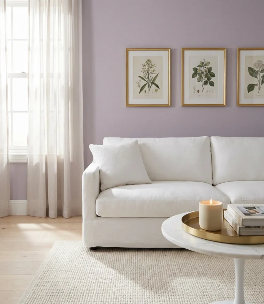 Lavender as a living room choice often surprises people by how versatile it is—it shifts dramatically depending on the undertone. A cool, grey-leaning lavender reads almost like a neutral and works in contemporary settings; a warmer, violet-leaning version feels more romantic and bohemian. The key to making it feel intentional rather than accidental is to pair it with deliberate metallic accents—gold or rose gold—that signal the shade was a choice, not a compromise between purple and grey.