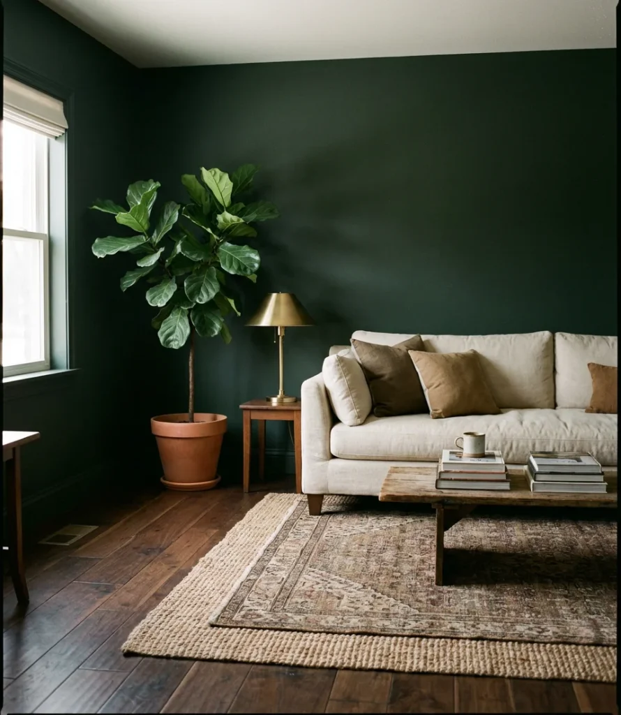 This look resonates strongly with what designers call the “biophilic turn” in American home design—a growing desire to bring natural, living elements indoors. Dark green walls essentially turn your living room into a backdrop for plants, amplifying the greenery and making even a single potted fern feel like a full indoor garden. Common mistake to avoid: choosing a green that reads blue in artificial light. Always test under evening lamp conditions before finalizing the color choice.