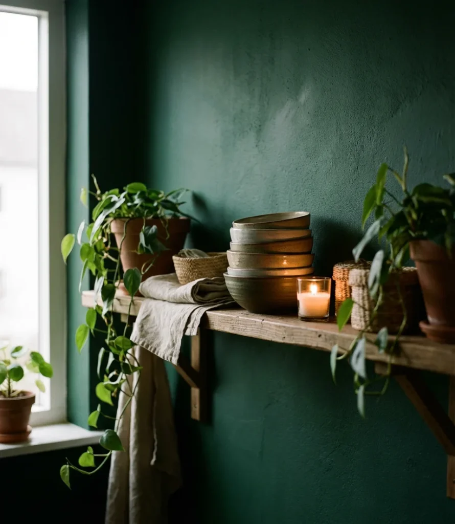 Moody deep greens—think hunter, forest, and bottle green—have emerged as perhaps the defining wall paint trend of the mid-2020s. Unlike navy or charcoal, dark green has an organic quality that feels simultaneously sophisticated and connected to nature. It works particularly well in living rooms that contain a lot of natural wood, plants, and warm-toned textiles, creating a layered depth that feels almost like being inside a terrarium.