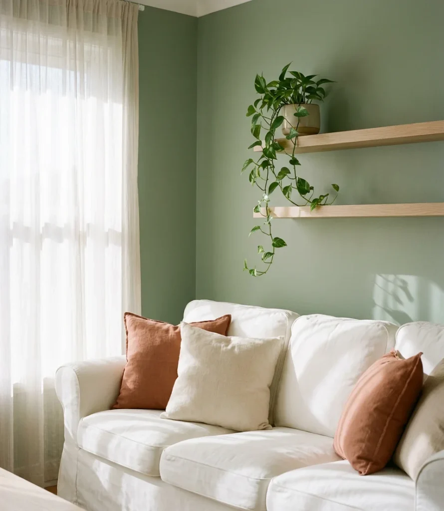 The combination of soft sage green wall paint and a white couch is one of those pairings that feels simultaneously fresh and timeless. Sage sits in that magical middle ground between green and grey—it reads as natural and organic without feeling too earthy or too cold. For homeowners who want color but aren’t ready to go bold, this pairing is the perfect entry point.