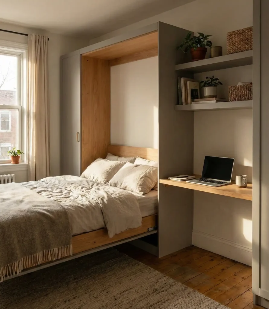 This layout is ideal for studio apartments or small bedrooms, featuring a desk that allows you to switch between work and rest without sacrificing floor space. A wall-mounted Murphy bed folds up during the day, revealing a clean workspace underneath. Pair it with a floating desk that runs the length of one wall, and you’ve got a dual-purpose zone that feels intentional, not makeshift. It’s a popular choice for remote workers who need a dedicated home office but don’t have a spare room to convert.