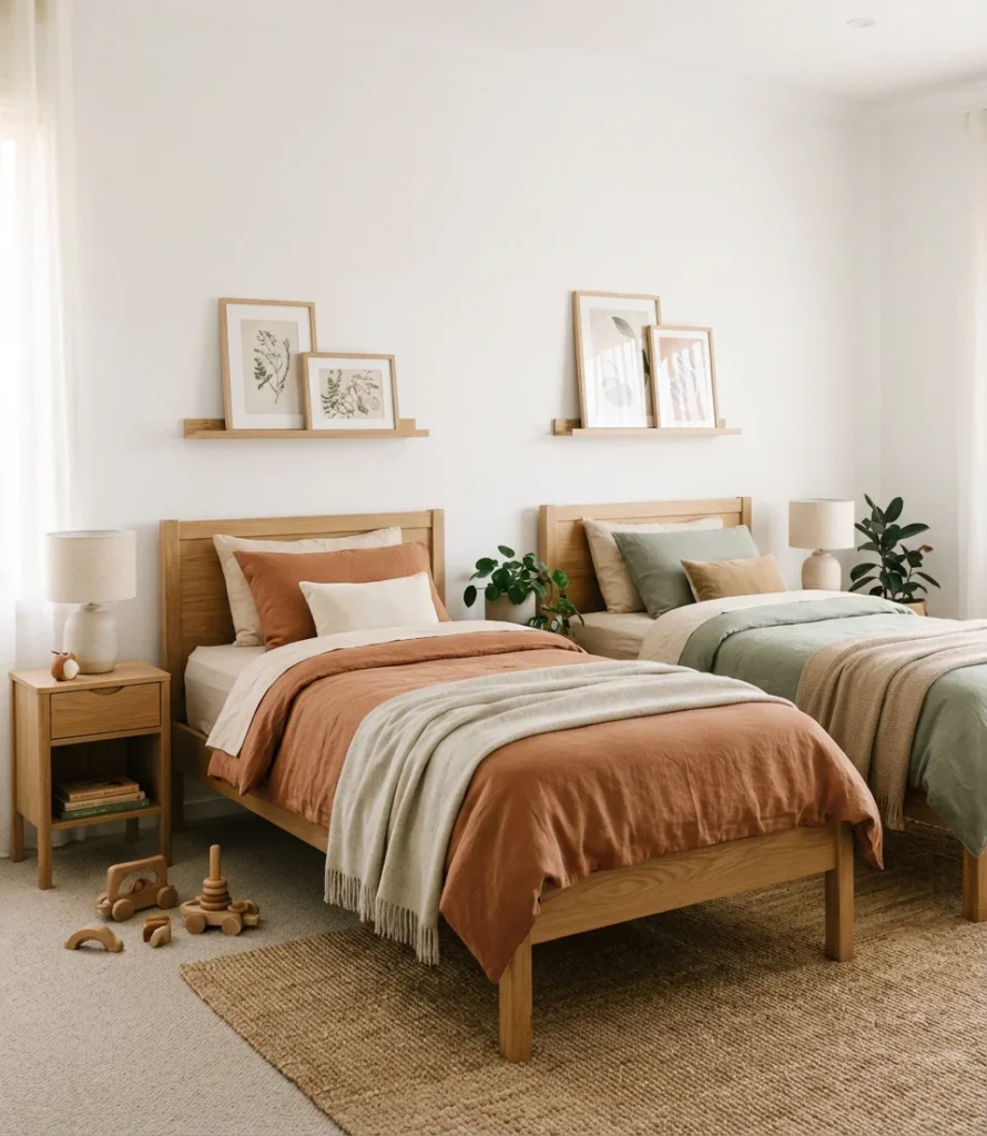 Designing a unisex room for siblings sharing a space is one of the most common challenges parents face—and going neutral is almost always the right move. Think warm whites, soft taupes, sage greens, and earthy terracottas rather than the worn-out pink-and-blue divide. These tones age gracefully as kids grow, and they create a calm, cohesive backdrop that lets each child’s bedding and accessories inject personality without clashing visually across the room.