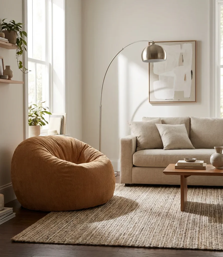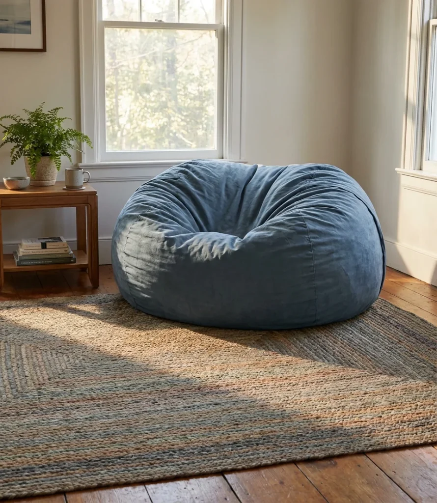 Interior designers working in contemporary residential spaces often use the modern beanbag as a “flex seat”—a piece that moves around the home based on need, functions as extra seating for guests, and doesn’t look out of place in almost any room. The key to pulling it off is material: smooth woven fabrics, performance canvas, or structured faux leather keep things grown-up. Avoid overly shiny or synthetic-looking materials in modern rooms—they tend to read cheap even when they’re not. Investing $180–$350 in a well-made modern beanbag will almost always look better than a $60 bargain version in the same space.